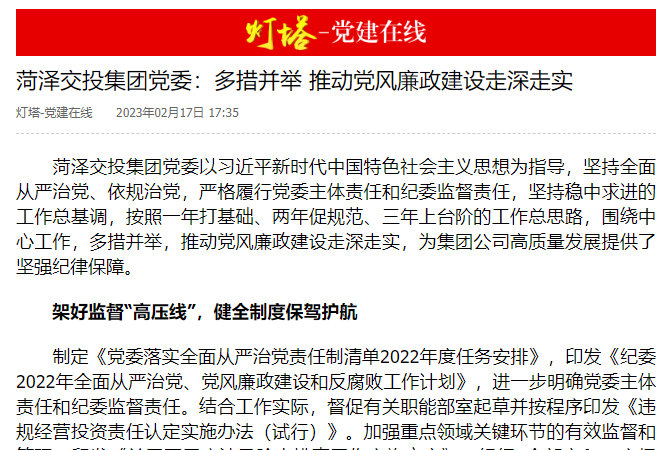菏澤交投集團黨委以習近平新時代中國特色社會主義思想為指導,堅持全面從嚴治黨、依規(guī)治黨,嚴格履行黨委主體責任和紀委監(jiān)督責任,堅持穩(wěn)中求進的工作總基調,按照一年打基礎、兩年促規(guī)范、三年上臺階的工作總思路,圍繞中心工作,多措并舉,推動黨風廉政建設走深走實,為集團公司高質量發(fā)展提供了堅強紀律保障。